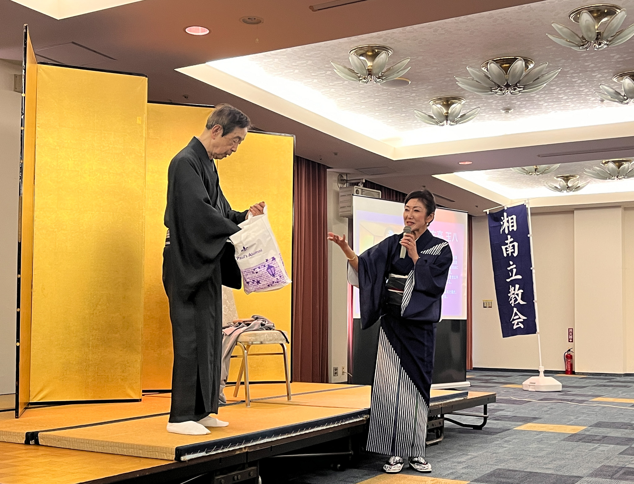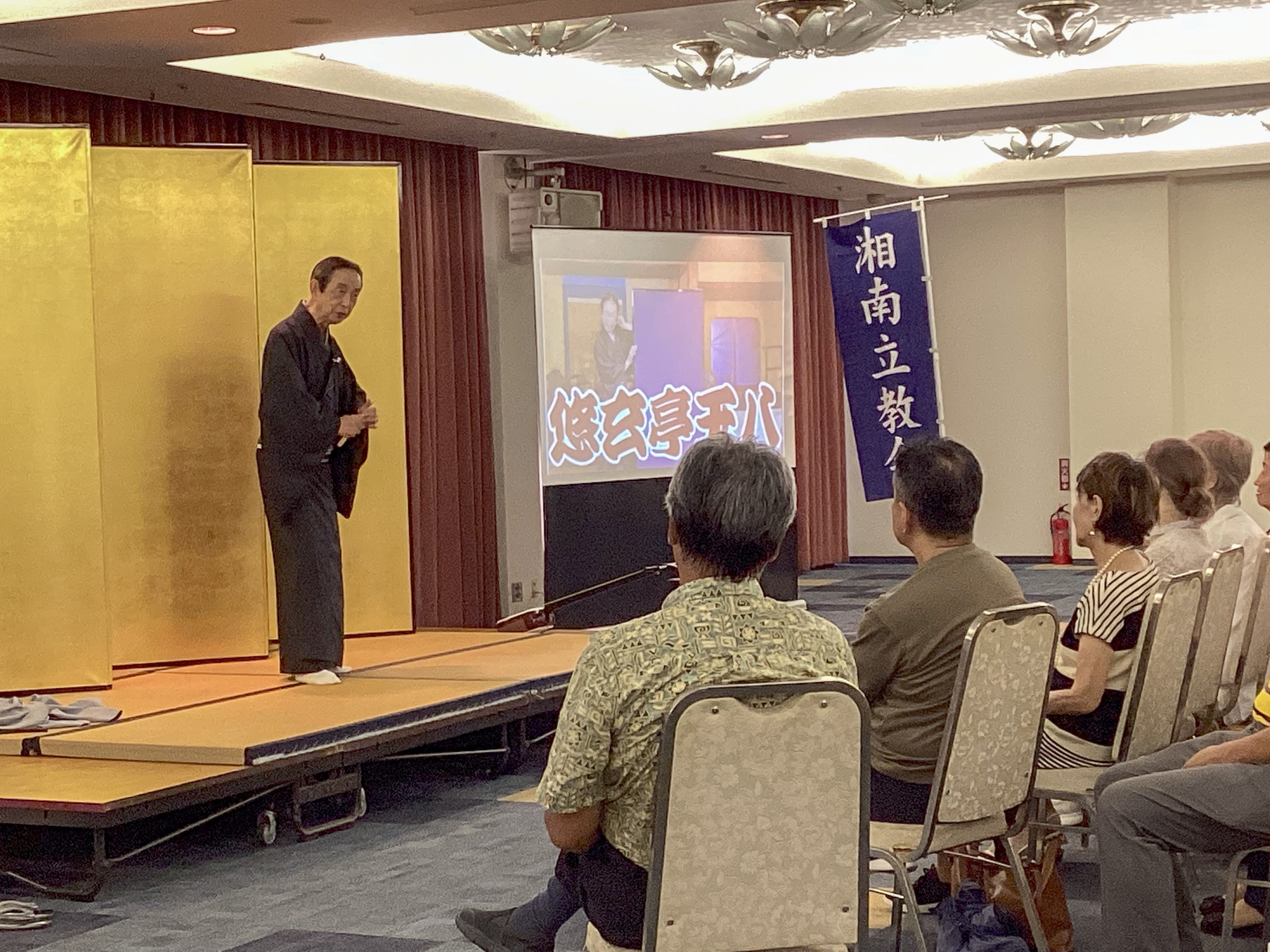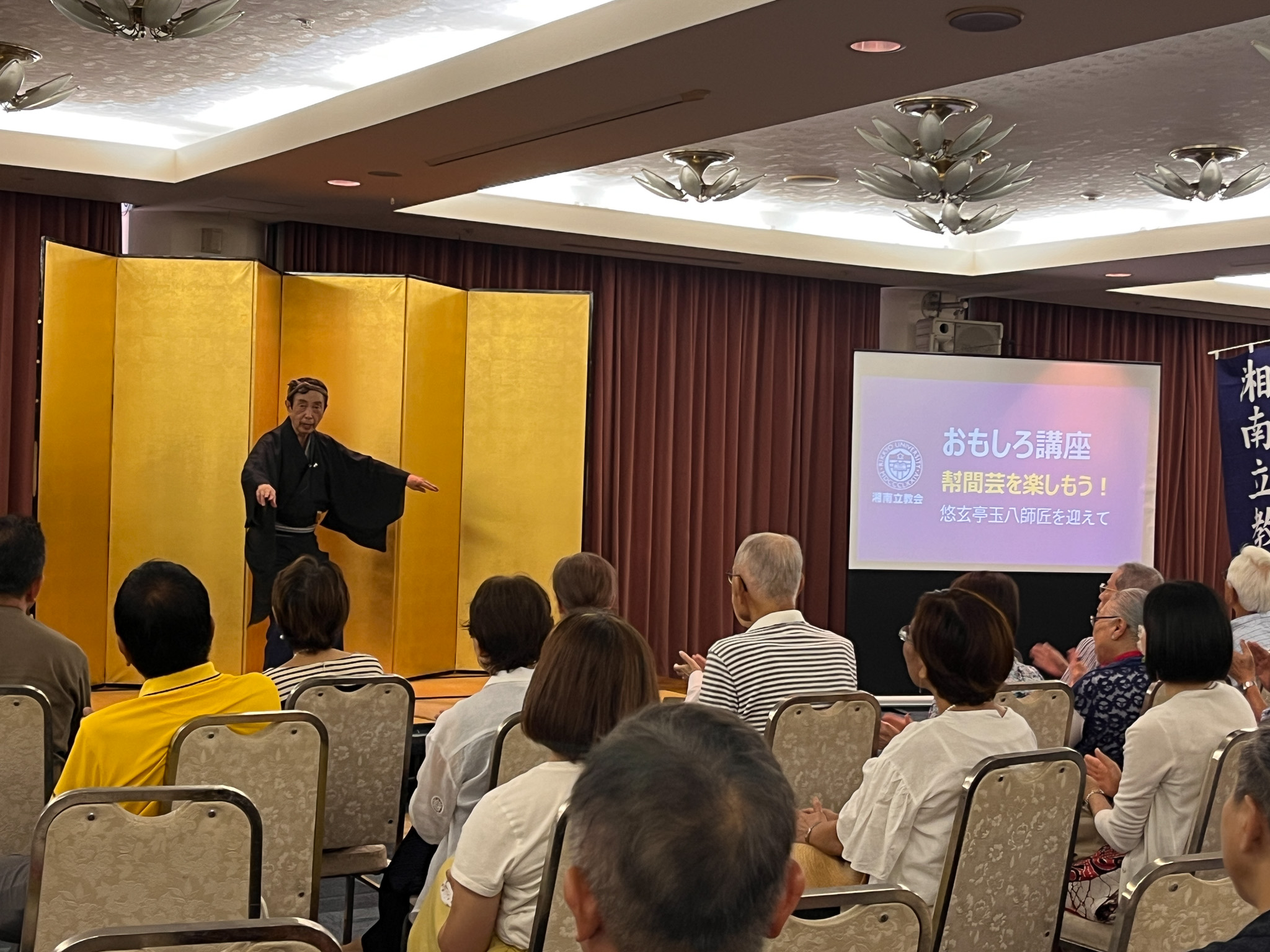 8月31日(日)、藤沢市民会館第二展示ホールで「第22回立教おもしろ講座」が開催されました。今回のゲストは、日本の伝統芸・幇間芸(ほうかんげい)の第一人者、悠玄亭玉八師匠。日本全国にわずか6人しかいない貴重な存在です。玉八さんのお師匠さんであった悠玄亭玉介師匠のご子息が湘南立教会会員の直井先輩というご縁があり、今回のおもしろ講座が実現しました。まさに「縁が芸を呼ぶ」ですね。