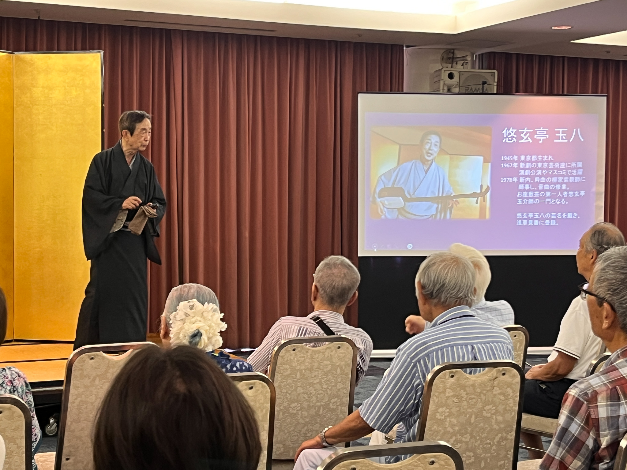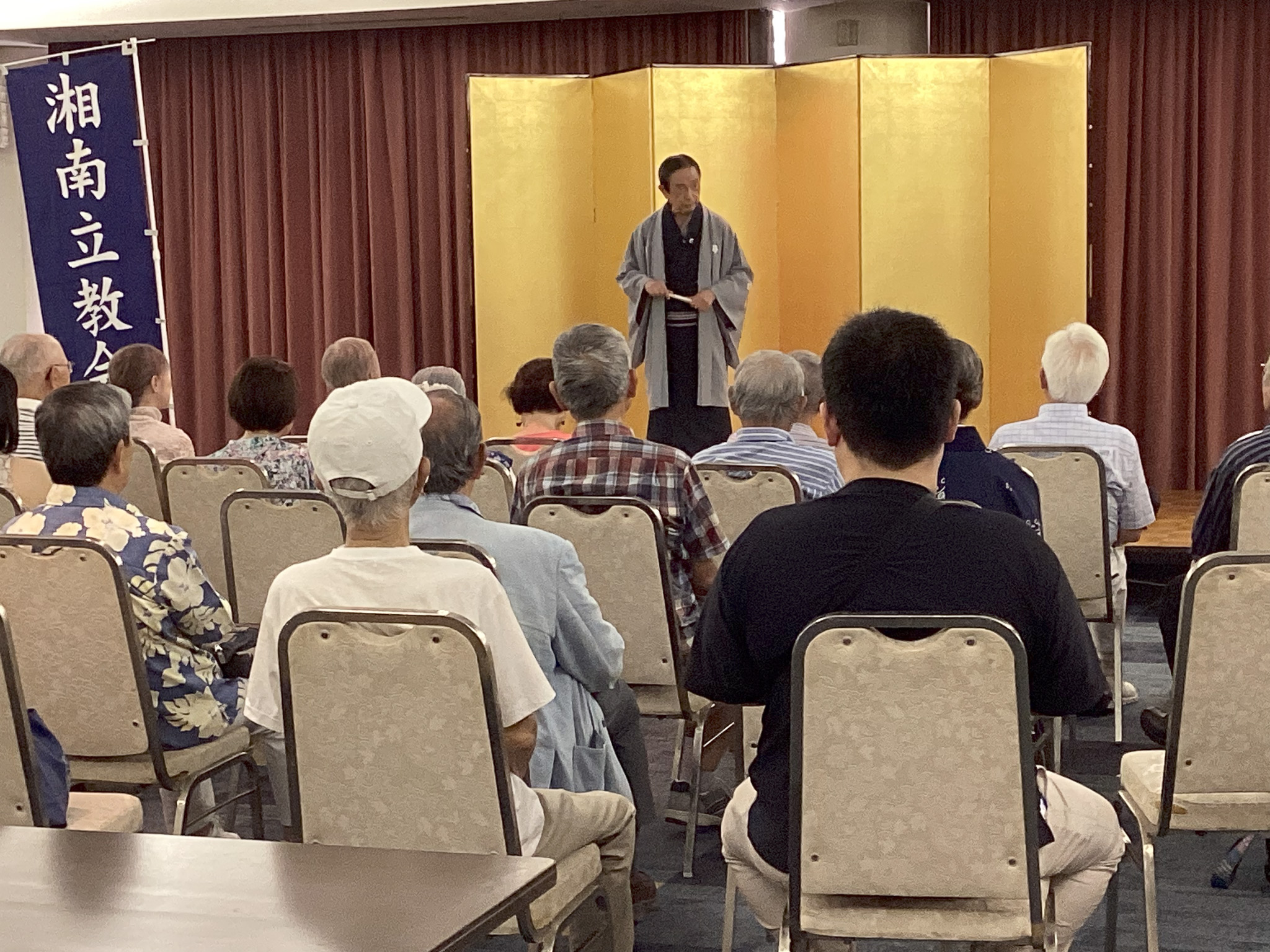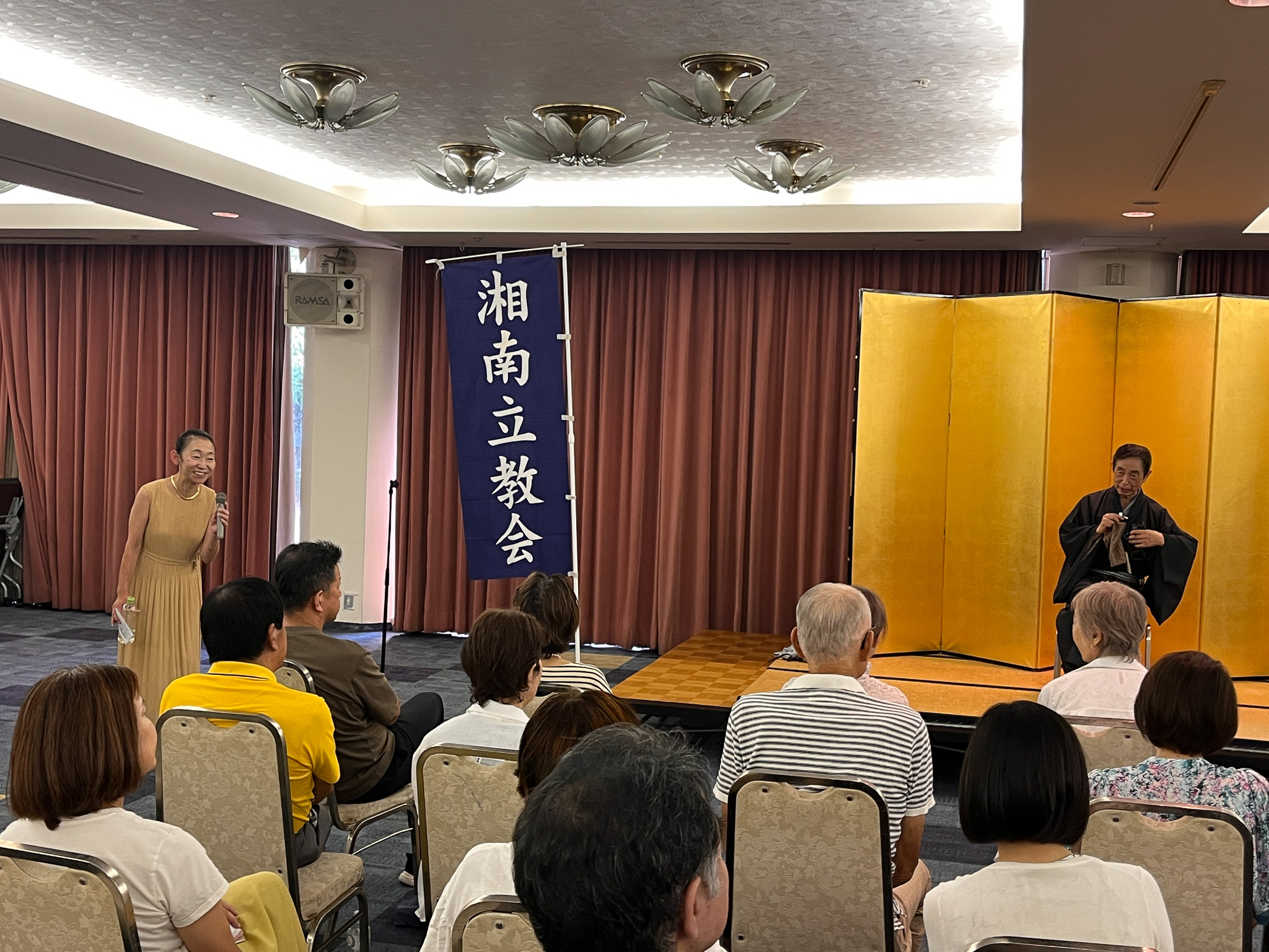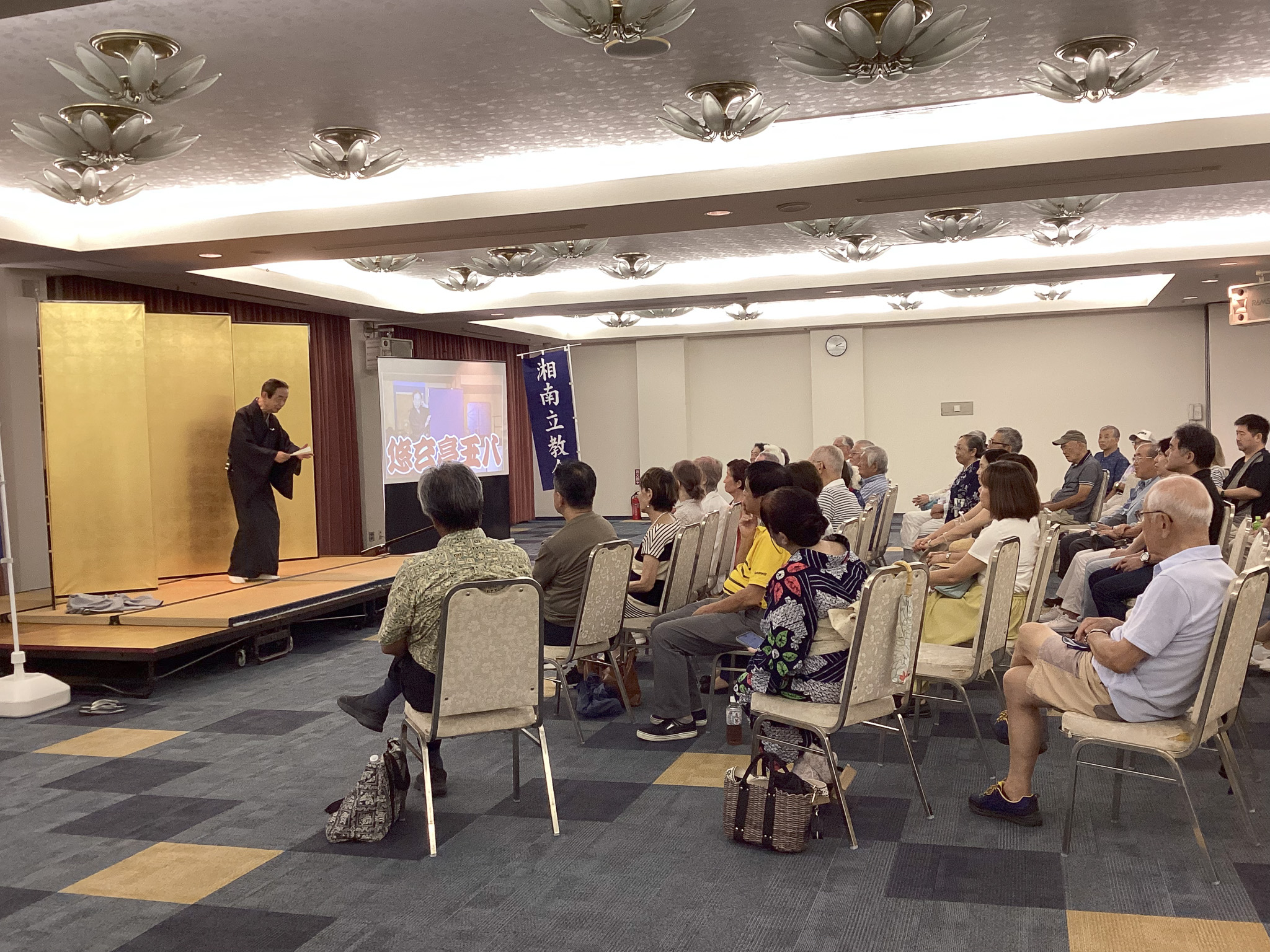 8月31日(日)、藤沢市民会館第二展示ホールで「第22回立教おもしろ講座」が開催されました。今回のゲストは、日本の伝統芸・幇間芸(ほうかんげい)の第一人者、悠玄亭玉八師匠。日本全国にわずか6人しかいない貴重な存在です。玉八さんのお師匠さんであった悠玄亭玉介師匠のご子息が湘南立教会会員の直井先輩というご縁があり、今回のおもしろ講座が実現しました。まさに「縁が芸を呼ぶ」ですね。